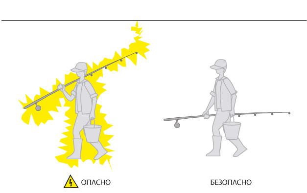 При перемещениях под ВЛ смертельно опасно поднимать удилища, нести их на плече - во избежание приближения и случайного прикосновения к проводам.