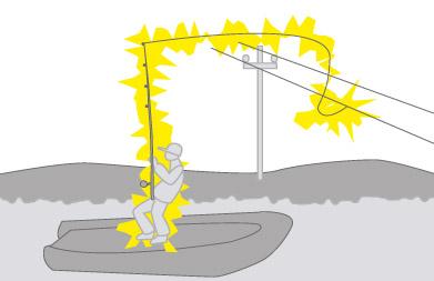 Необязательно прикасаться к токоведущим частям, чтобы получить смертельный удар. Благодаря высокой разности потенциалов электрический ток может «пробить» воздушный промежуток длиной от нескольких десятков сантиметров до нескольких метров. При повышенной влажности воздуха опасное расстояние возрастает, а при использовании углепластиковых удилищ оно может достигать десятка метров.